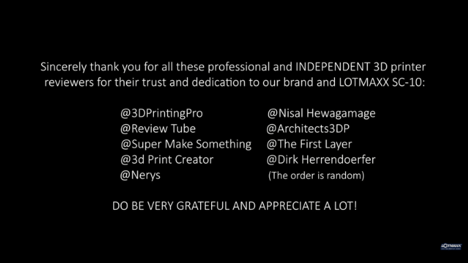 • 親愛(ài)的,LOTMAXX 的整個(gè)團(tuán)隊(duì),衷心感謝所有這些專(zhuān)業(yè)且獨(dú)立的 3D 打印機(jī)測(cè)評(píng)人對(duì)我們品牌和 SC-10 的信任和奉獻(xiàn)。